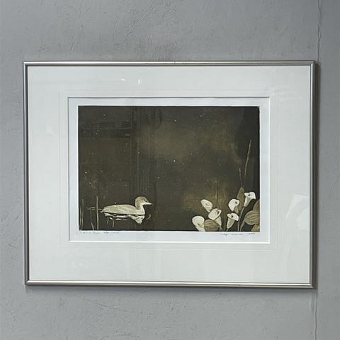 Tyylikäs grafiikkateos ”Yön lintu”, jossa on kuvattuna lintu ja kasveja. Teos on signeerattu(ei tunnistettu) ja päivätty vuodelle 1996. T.p.l.a. 2/10