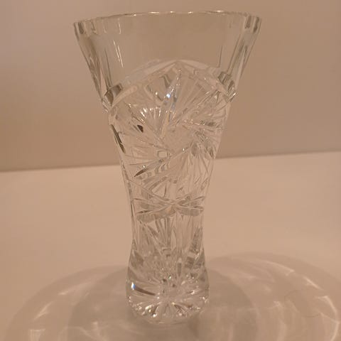 Kaunis, isohko kristallimaljakko. Mutta... joskus on jalkaosa rikkoutunut ja ei niin kovin kauniisti liimattu kasaan.
