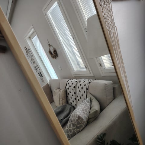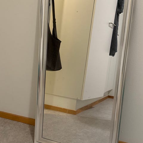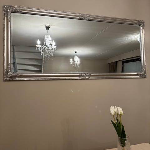 Siististi hopeaksi maalattu peili.