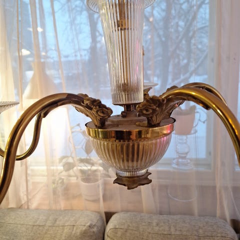 Vanha upea kolmihaarainen valaisin. Toimiva ja kaikki lasikuvut ehjiä. Valaisimen valmistajasta ei ole tietoa.