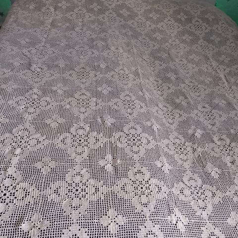 Ruskeamustavalkokuvioinen parivuoteen päiväpeite,molemmissa sivureunoissa virkattu ruskea pitsi. Rypistymätön kangas,ei ole puuvillaa. Ehjä ja pesty,hieman käytössä ollut.