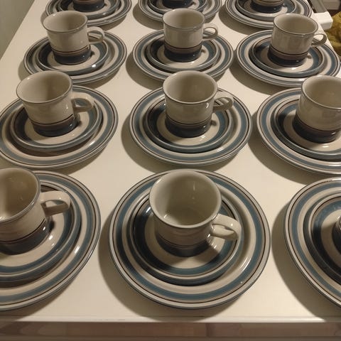 Piippuleimalliset(1932-1949) Arabian kahvi/teekupit. 8kpl. Niin sanottua xx- mallia. Halkaisija 9,5cm ja korkeus 5,5cm. Tasseja 17kpl. Lisäksi samaa sarjaa ruokalautaset, halkaisija 22,5 cm. Ikäisekseen hyväkuntoiset; raidoissa kulumaa, yhdessä kupissa lasituksessa halkeama, yhdessä kupissa halkeama. Mutta ei ole hinallakaan pilattu. Kaikki yht. 20e. Postitetaan, kun maksat postit.