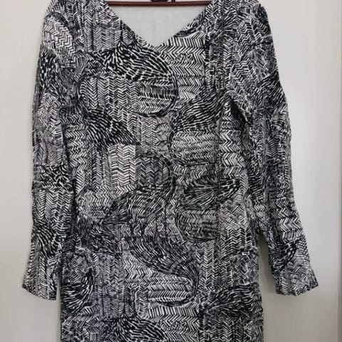 Marimekko Olivia Hulahula mekko, koko XL, valmistettu puuvillasta. Mekossa mustavalkoinen kuviointi ja pitkähihat.