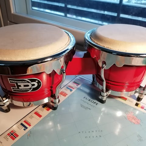 Pearl Elite Series bongo-rummut, joissa on metalliset kalvot ja mustat rungot. Käytetty mutta hyvässä kunnossa.
