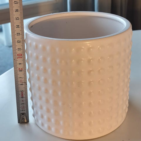 Keraaminen kukkaruukku, jossa on mustavalkoinen geometrinen kuviointi. Ruukun korkeus on noin 14 cm.