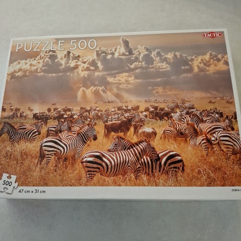 Tactic Puzzle 500 palaa savannilla -palapeli, jossa on 500 palaa ja valmiin kuvan koko 47 x 31 cm. Palapeli esittää savannin maisemaa ja seeproja.
