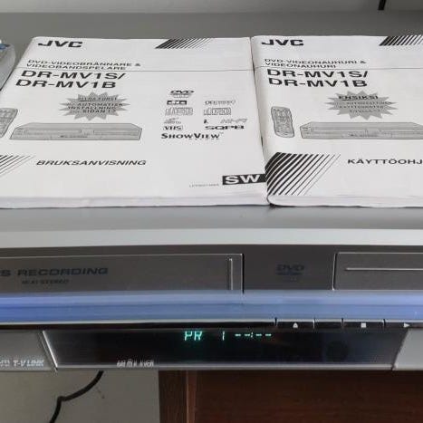 Philips DVDR3430V DVD/VHS laite jossa on kaukosäädin sekä ohjekirja mukana.DVD puoli toimii moiteettomasti mutta VHS imaisee nauhan sisään.