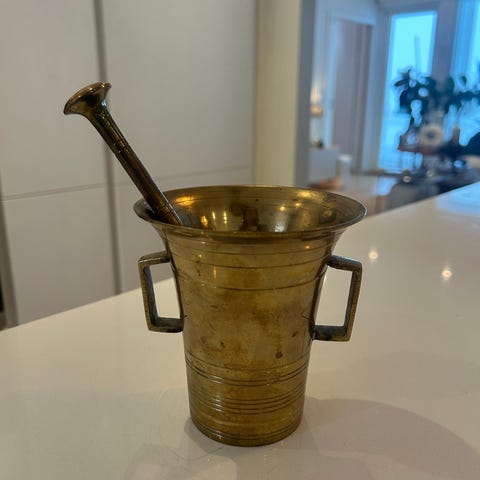 Kuparinen mortteli ja survin, jotka soveltuvat mausteiden ja yrttien murskaamiseen ja sekoittamiseen keittiössä.