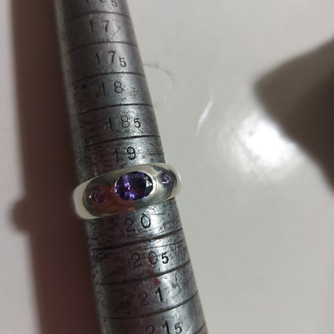 Sormus on leikattu 1mm sterlinghopeasta, juotettu, kiillotettu ja vasaroitu, ja siihen on lisätty 5mm ametisti.