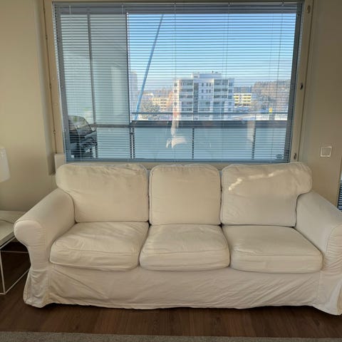 myynnissä ikea ektorp beige. Melko hyvä kuntoinen, muutama tahra sohvassa. En ole kokeillut pesua. Päälliset saa helposti irti. myös kangas pienesti revennyt sohvatyynyjen alta. Koiratalous.