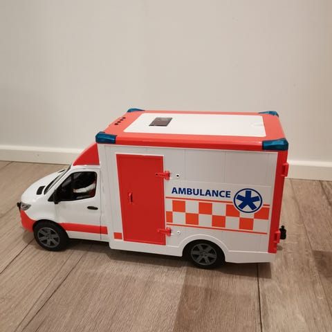 Bruder ambulanssi ja poliisiauto lasten leluajoneuvot. Ambulanssi on varustettu takaluukulla ja ramppitoiminnolla. Poliisiauto on valkoinen, ambulanssi valkoinen punaisin ja sinisin yksityiskohdin.
