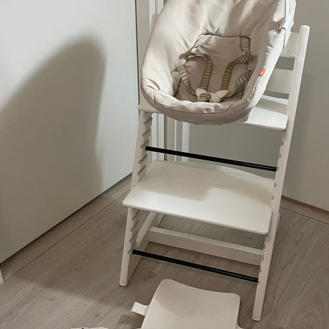 Myydään punainen Stokke Tripp Trapp setti johon kuuluu tuoli, newborn osa, punainen babyset valkoisella tarjottimella ja kaatumisen estoon lisätuet.