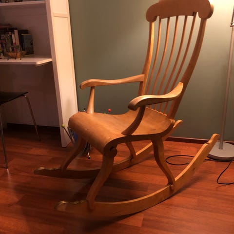 Puinen keinu tuoli tummanruskealla viimeistelyllä. Tuolissa on selkänoja ja käsinojat sekä pääntuki. Soveltuu sisäkäyttöön rentoutumiseen ja istumiseen. Voidaan toimittaa Savonlinnan seudulle.