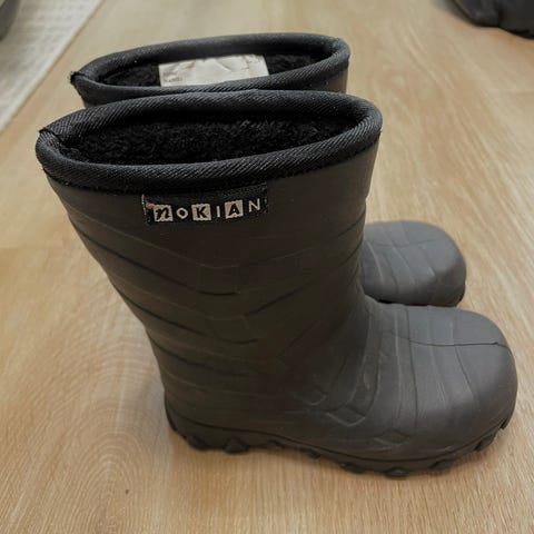 Erittäin kevyet lasten mustat kumisaappaat lämpimällä karvavuorilla. Koko 23. Vain pari kertaa ehditty käyttää rattaissa, näillä ei ehditty kävellä, kunto erinomainen.