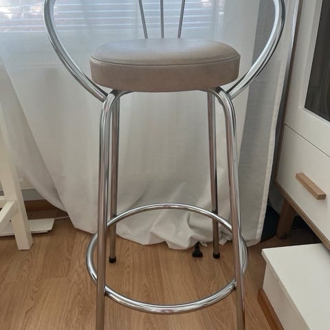 Jyskin korkeat tuolit, jossa valkoinen keinonahkainen istuin ja selkänoja.