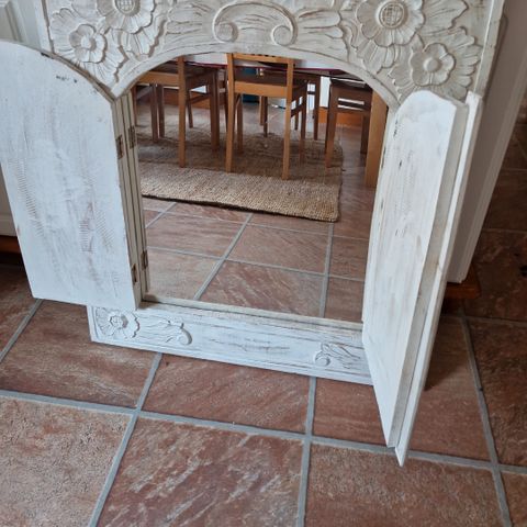 Ammattipuusepän/koristeveistäjän kädenjälkeä ja upeaa sellaista. Koivupuusta Tehty 2010 vuonna, mutta 2025 kesällä saanut maalin. Upeat yksityiskohdat ja maalaukset. Mitat K105cm L40 Lasi n mitta 50*30 Joka on fasetti hiottu. Kysymällä kerron lisää hp 500€