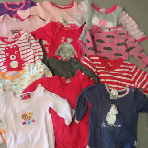 Löytyy kietaisu bodyja, pään yli bodyja ja kasa housuja. Kaikki pesty hajusteettomalla pesuaineella mut suosittelen pesemään ennen käyttöä. Ovat olleet jemmassa noin vuoden.