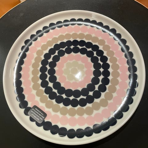 Marimekon käyttämätön elämäni värit lautanen tarroilla.
