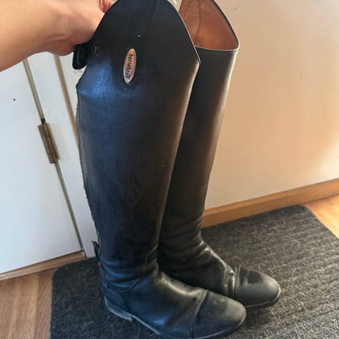 Siistit käytetyt nahkaiset ratsastussaappaat. Koko on reilu 37, itselläni yleensä on 38 kengät. Pieni rispaantuma kuminauhassa, siitä kuva.