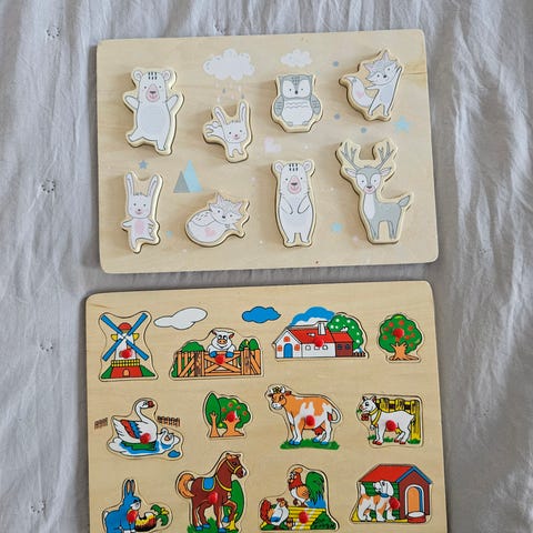 Kaksi palapeliä seuraavalle pienelle. Kilpikonna-aiheinen 4x4 kokoinen. Paksut palat sopivat pieneen käteen.