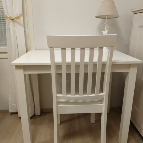 Pöytä ja tuoli joissa vähän kulumia/pieniä jälkiä. Ollut tietokonepöytänä. Toimii hyvin koululaiselle myös läksyjen yms tekemiseen.