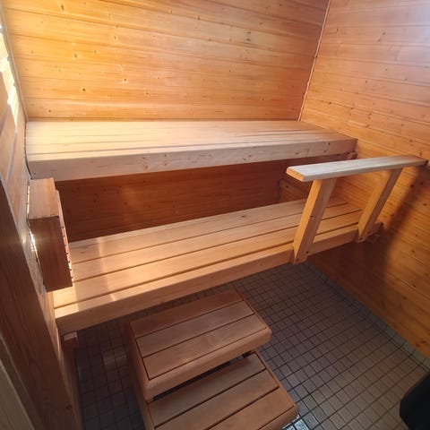 Pienen saunan siistit lauteet. Leveys noin 146cm. Alaporrasta ei ole. Kiukaan kivet alemmalla tasolla nyt vähä häiritsee kuvassa. Tarjoa!