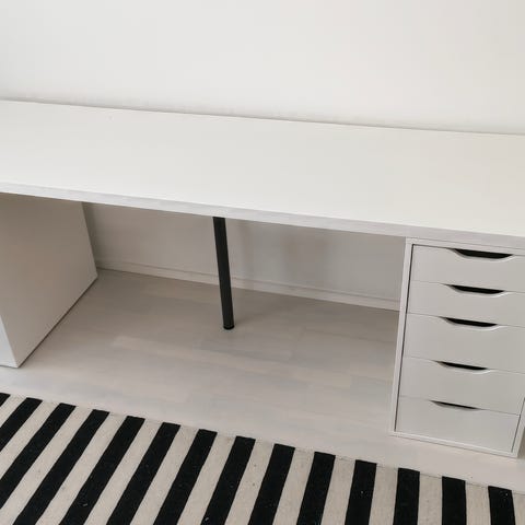 Ikean setti: Alex laatikosto syv. 58,5 lev. 36 kork. 70cm , Linnmon pöytätaso 150 x 75 x 3,5cm ja Godvin jalat 70cm. Pöytätaso ei ole ollut kiinnitettynä laatikostoon joten ne voi käyttä erikseen jos tarve.