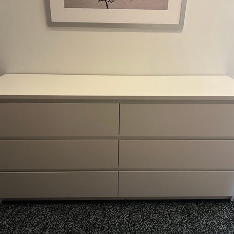Siistikuntoinen Ikean Malm-lipasto kuudella vetolaatikolla. Mukaan lasinen päällyslevy.