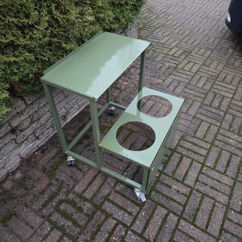 Esillelaittoteline kolmella tarjouslaarilla. Kokonaiskorkeus 190cm ja kulujen halkaisija 45cm.
