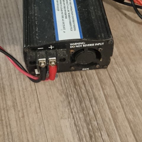 Inverter. Muuntaa 12-volttisen (mm. auton akusta) 240-volttiseksi sähköksi. 100W. Sopii mm. asuntoautoon.
