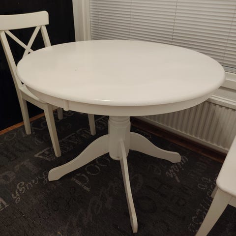 Kaunis ja tukeva pöytä joka kaipaa uutta maalipintaa tasolle.