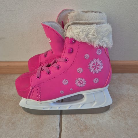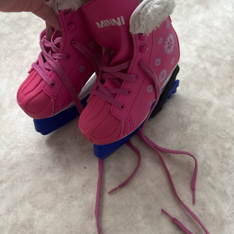 Minni luistimet koko 31. Pohjallisen mitta noin 19,5 cm. Ostettu Torista, ei tullutkaan meillä käyttöön, kun siirryttiin suoraan hokkareihin. Toinen nauha vaatisi uusimisen, mutta toimii näinkin.