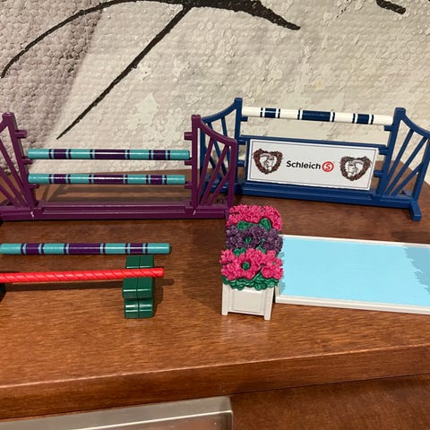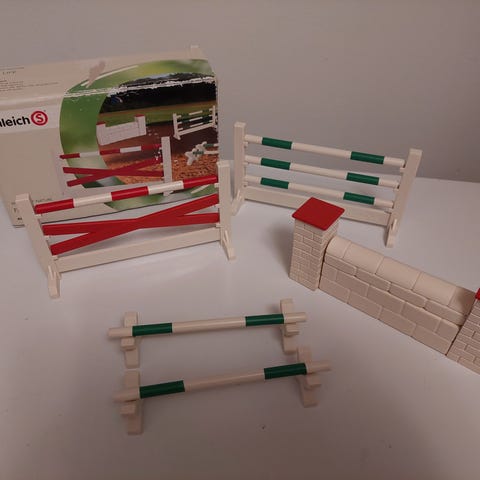Tämä on aito Schleichin estesetti, vanhempaa tuotantoa. Ei enää valmisteta. Sisältää puomit, ristikon, muuriesteen ja kavaletin: