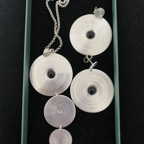 Kalevala Hopeinen Börje Rajalinin suunnittelema korusetti spektroliittiä. Settiin kuuluu kääty, rannekoru, kahdet korvakorut. Spektroliittikorvakorut ovat isompaa kokoa ja klipsillä. Pienemmät ovat toisesta KK:n ametistisetistä pienemmät ja nekin kilpsillä. Setti on hyväkuntoinen. Laitan lisäkuvia pyynnöstä.