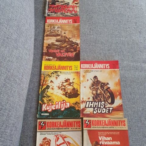 22 kpl korkeajännitys sarjakuvia. 5 on hieman paksumpaa. Vuosilta 1974-1990. Mukaan myös kolme muuta pokkaria. King kong, siivet ja myrkky.