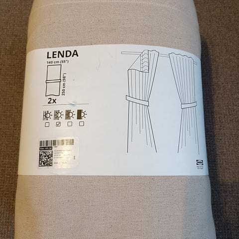 Ikean harmaat, osittain pimentävät/peittävät Lenda-verhot. Kuvassa kiinnityslenksut käännetty taakse. Pituus mitattu ilman lenksuja.