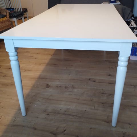 Tosi iso ruokapöytä ja neljä pehmustettua vihreää tuolia. Pöydässä naarmuja mutta muuten täysin toimintakuntoinen ja tuoleissa hiukan kissojen raapimajälkiä muttei mitään mikä pistäisi silmään.