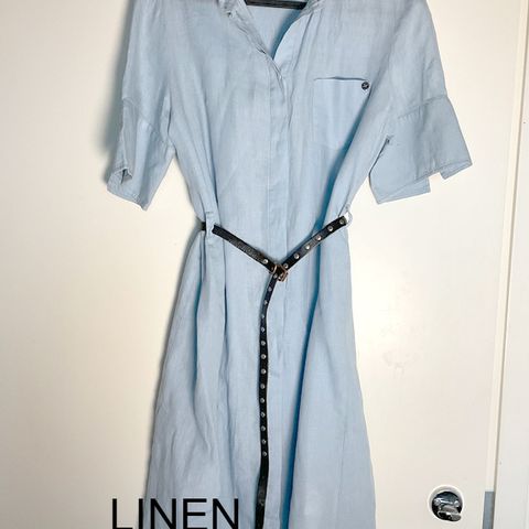 Raidallinen kietaisumekko koko M. 100% pellavaa. Nauha lähtenyt purkautumaan, näkyy viimeisessä kuvassa.