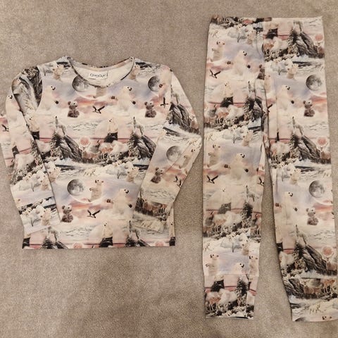 Oikein hyväkuntoinen ja siisti lasten yöpuku. Yhdellä lapsella vähän käytetty. Materiaali puuvillatrikoota. Housuissa säätö vyötäröllä.