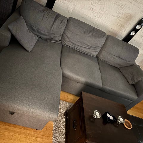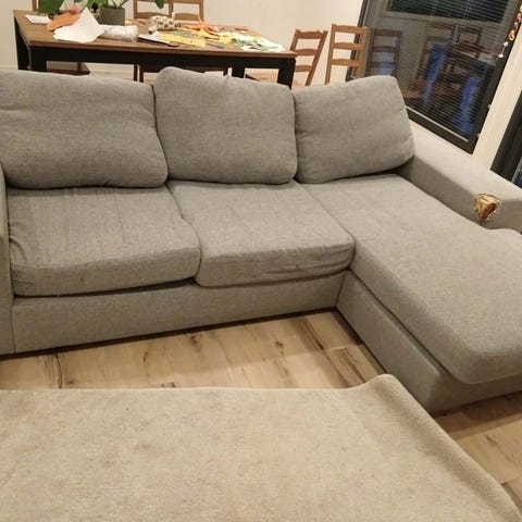 Askosta 2013 ostettu tummanharmaa divaanisohva. Divaaniosan puoli vaihdettavissa, meillä ollut aina oikealla puolella. Lapsi- ja kissatalous eli paljon käytön jälkiä. Tarkempi tarhojen ja karvojen puhdistus jää hakijalle. Omat kantajat.