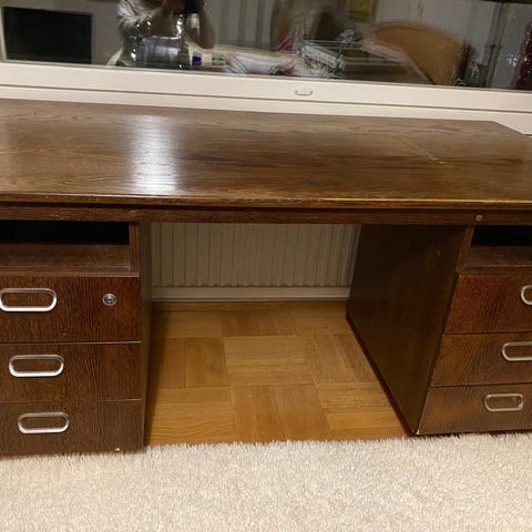 Yleisilmeeltään siistikuntoinen, puinen kirjoitus-/työ-/sivupöytä. Korkeus 69,5 cm. Pöytä on kaikin puolin ehjä, mutta erit. pöytälevyn pinnassa jonkin verran kolhua ja painaumaa.