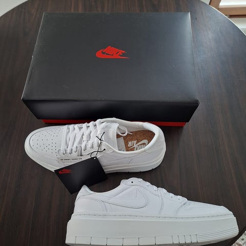 Käyttämättömät Niken Air Jordan Elevate Low White -mallin tennarit.