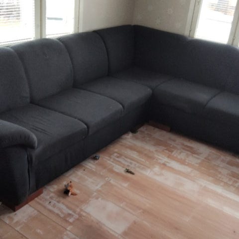 Kulmasohva oranssi-ruskeaa nahkaa. Sohvassa on kolme irrotettavaa selkätyynyä ja kolme istuintyynyä. Sohvan jalat ovat metallia. Sopii olohuoneen istuin ratkaisuksi ja tarvittaessa pysty nukkuun.