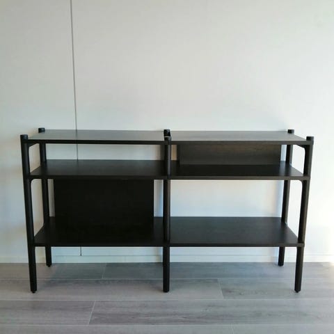 Jalat ja sokkeli massiivitammea, hyllyt tammivaneria.