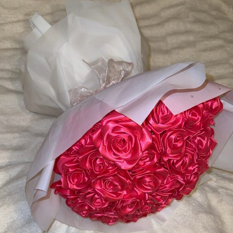 Finnmari sidottu valkoinen 7 oksan kukkakimppu, jossa aavistus myös vaaleanpunaista osassa terälehtiä. Tuuheat lehdet, varsia saa taivuteltua. Korkeus 29 cm. Ruusut ovat uudet, ovh. 16,90 euroa.