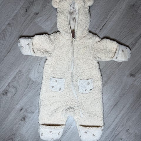 Yhdellä vauvalla hetken aikaa käytössä ollut Newbien suloinen teddyhaalari. Hupussa nallen korvat. Hihan ja lahkeensuut käännettävissä. Postitus ok, postimaksut ostajalle.