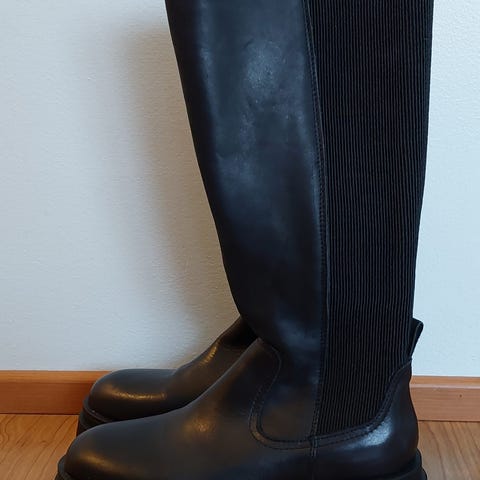 Mustat nahkasaappaat, koko 39. Saappaissa on nyöritys ja vetoketju, jotka helpottavat pukemista. Pohja on kumia ja siinä on kuvioitu pito. Saappaat ovat polven korkeudelle ulottuvat.