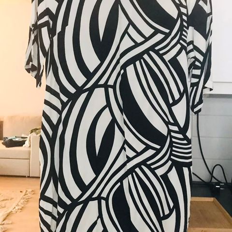 Marimekon musta mekko vyöllä, kokoa S. Vyötäröllä nukkaa, voin koittaa poistaa nukkaleikkurilla. Materiaalit: Asetaatti 68%, polyesteri 32%. Sovitus Käpylässä onnistuu.