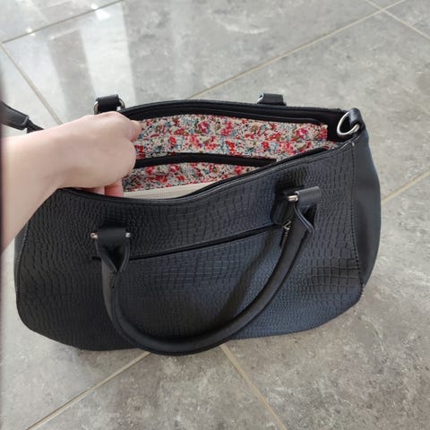Myynnissä musta nätti käsilaukku. Takana vetoketkutasku. Sisäpuolella vetoketjullinen tasku ja 2 lokeroa. Laukussa vetoketju.