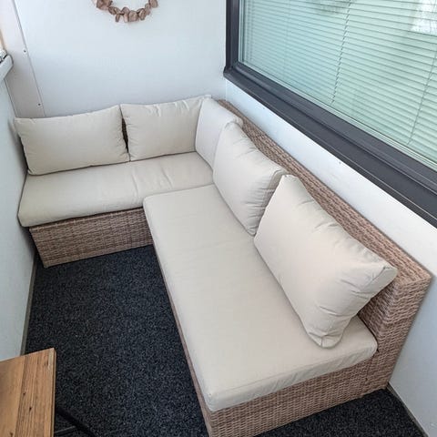 Uusi Mooda Kallas kulmasohva parvekkeelle, todettu liian isoksi. Ovh 1090, ostettu nyt alesta.
